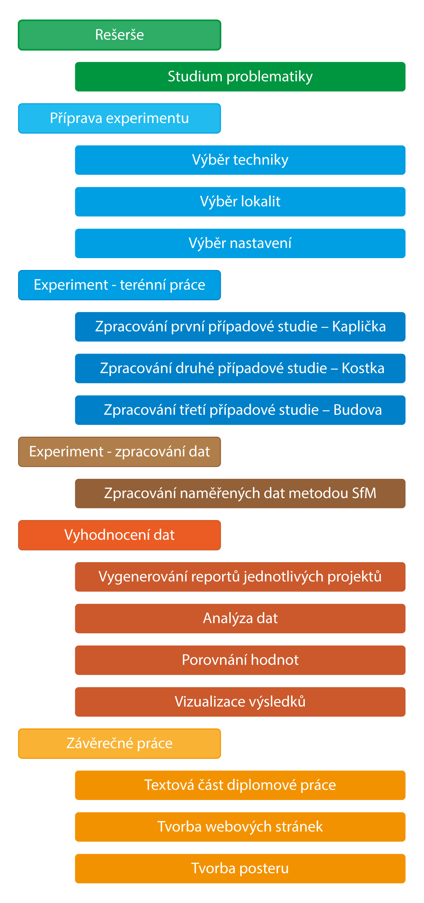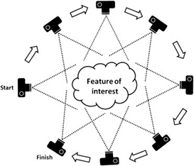 V rámci diplomové práce bylo provedeno několik experimentů s využitím metody Structure from Motion (SfM). Směrem pohybu okolo objektu zájmu se zabýval v roce 2012 Westoby ve své studii s názvem “‘Structure-from-Motion’ photogrammetry: A low-cost, effective tool for geoscience applications” (2012), stejně tak i Pavelka a kol. (2015). Oba uvedli, že fotografie je vhodné pořídit pravidelně okolo objektu s velkým překryvem 70 % - 80 % a ideálně v vněkolika řadách.