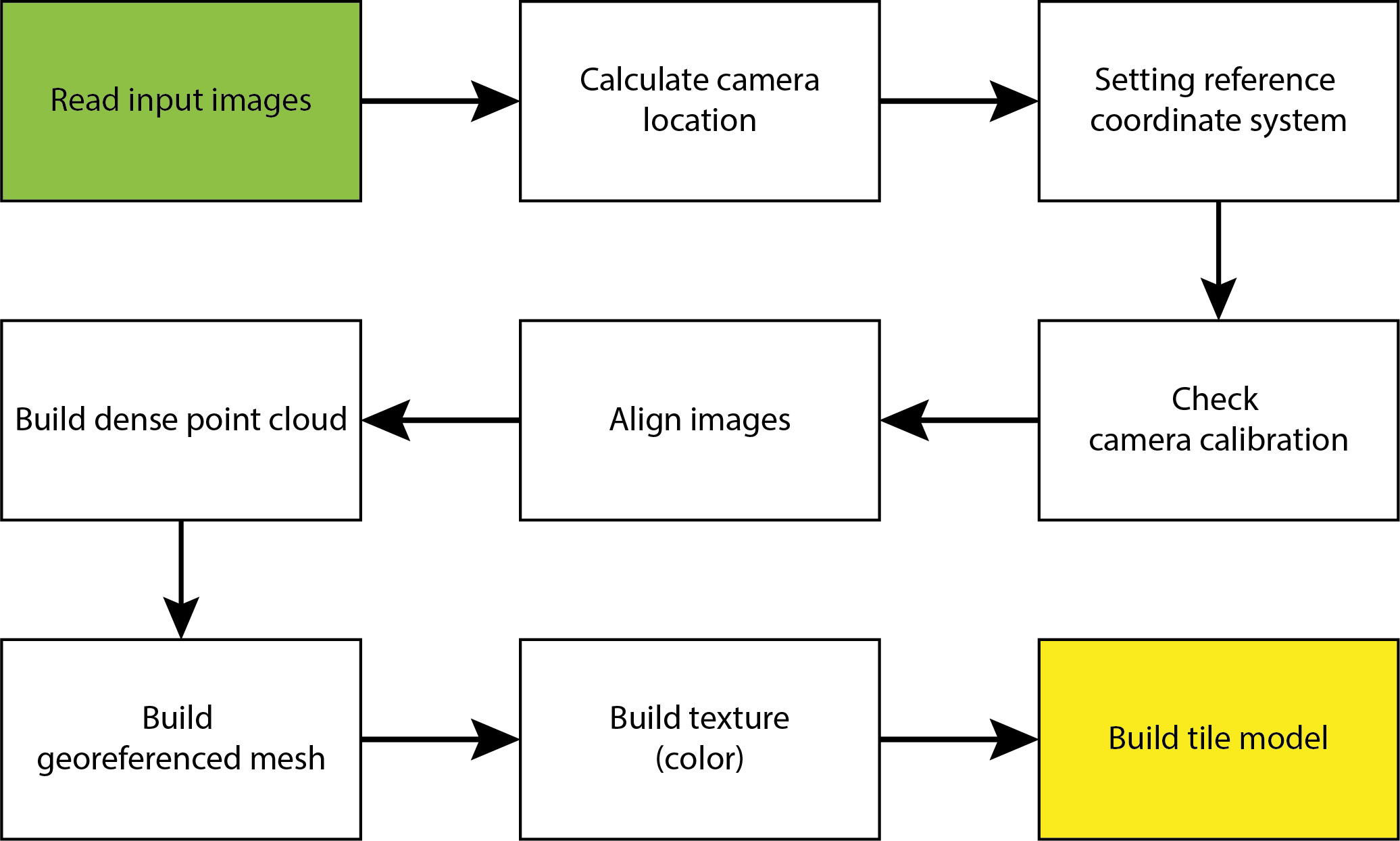 Veškeré vlastnosti a nastavení programu Agisoft Metashape jsou podrobně popsány ve volně dostupném manuálu na webových stránkách. Pro účely této práce se však některá nastavení ukázala jako zásadní. Jedním z klíčových prvků každého projektu je zarovnání snímků pomocí nástroje Align photos, které zásadně ovlivňuje přesnost a dobu zpracování. Zvolení přesnosti při zarovnávání má významný dopad na výsledky. Například vysoká přesnost pracuje s fotografiemi původní velikosti, kdežto nastavení střední přesnosti způsobí zmenšení snímků dvakrát. Nastavení nízké přesnosti zmenší vstupní snímky až čtyřikrát, což může být v některých případech užitečné pro prvotní odhad polohy. Naopak nejvyšší přesnost zvětšuje vstupní snímky a je doporučeno spíše pro výzkumné účely."